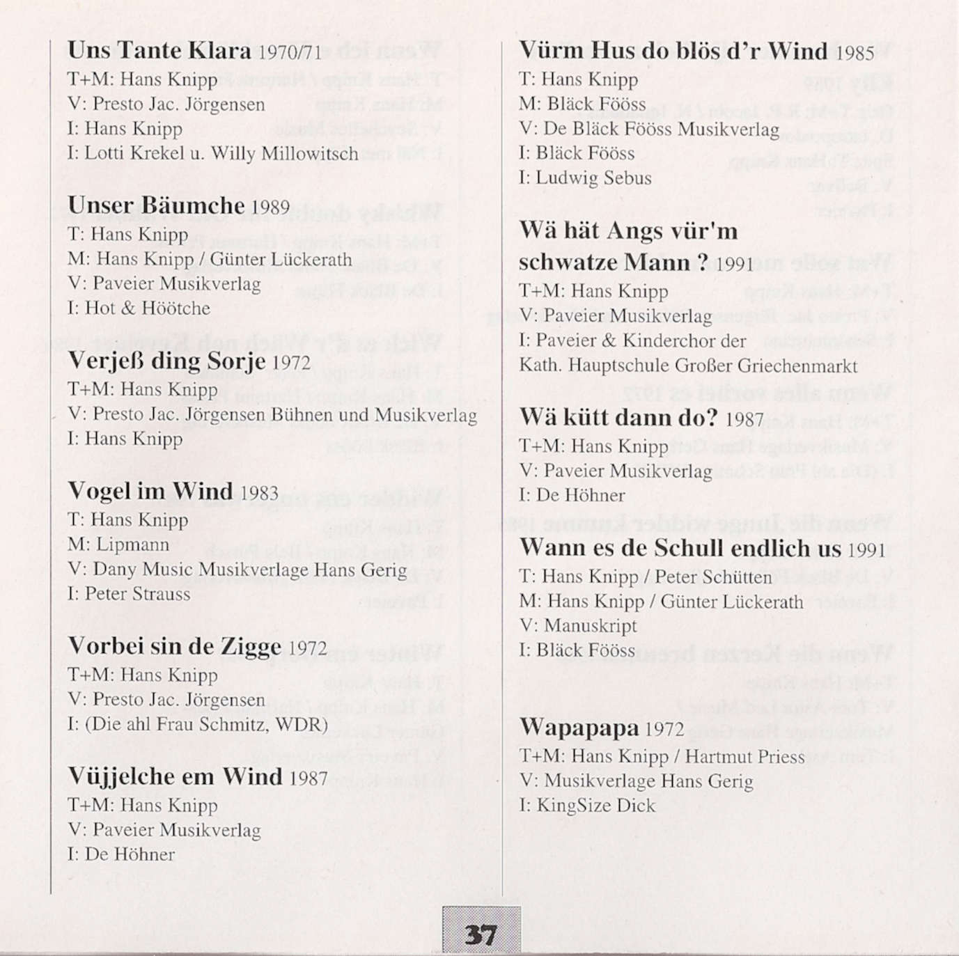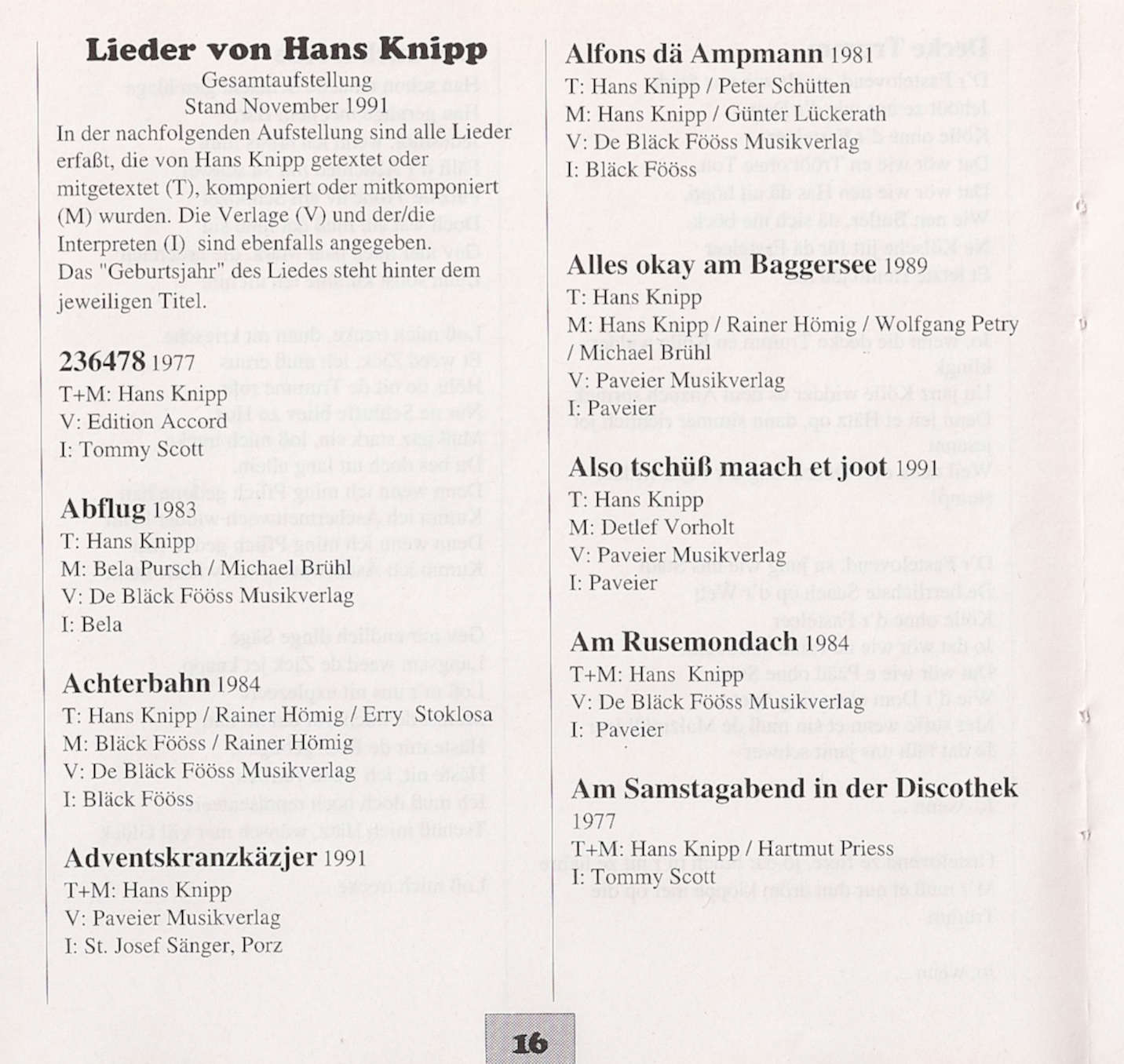 In den nachfolgenden Aufstellungen - Stand 30. September 1991 - sind alle Lieder erfaßt, die Hans Knipp bis zudisem Zeitpunkt komponiert, getextet etc. hat. Das Datum der Veröffentlichung und die Namen der jeweiligen Interpreten sind ebenfalls vezeichnet.