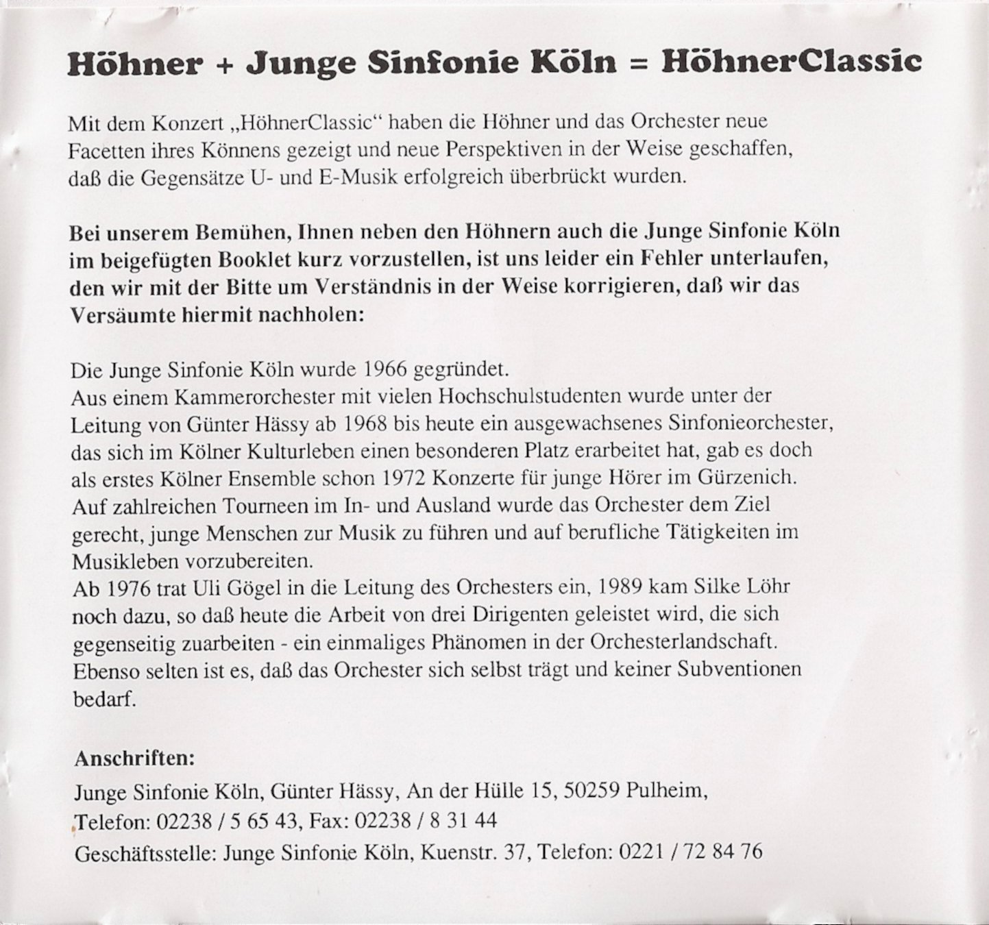 Günther Haessy, Dirigent der Jungen Sinfonie Köln, wurde kreidebleichals ich ihm die Panne offenbarte. Es dauerte etwas, ehe er sich beruhigt hatte. "Selbstverständlch werden wir bei allen Exemplaren eine mit Ihnen abgestimmte Korrektur anbringen, bevor sie das Haus verlassen!", sagte ich ihm, nachdem ich mich zuvor tausenmal entschuldigt hatte.