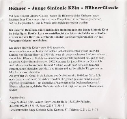 Doch diesmal war es anders. Erst am Tag der Vorstellung trafen die ersten CD ein und beim öffnen des Booklets traf mich fast der Schlag: Anstelle der "Jungen Sinfonie Köln" stand dort die "Junge Philharmonie Köln" als Partner bzw. Begleitung der Höhner.